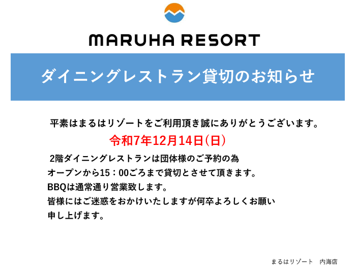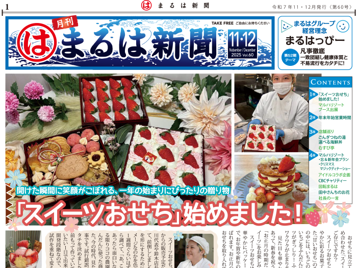 2025.11.01【まるは食堂】ふるさと納税3.0 ふるさと納税×クラウドファンディング 2025.09.30【南知多豊浜本店】まるはのふぐ料理 令和7年11月1日~ 2025.11.30【南知多豊浜本店】EV充電器設置のご案内 2025.12.13【まるはグループ】まるは新聞 令和7年11、12月号のご案内 2025.12.13【まるはリゾート】12/14(日)ダイニングレストラン貸切のお知らせ もっと見る オンラインショップ まるはとは 採用情報 お客様の声 メールマガジン登録 Instagram 社長ブログ 各店舗ブログ まるは食堂