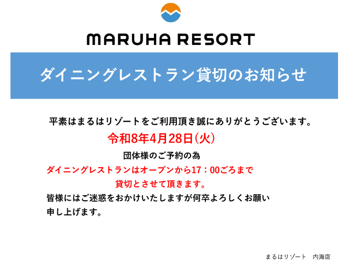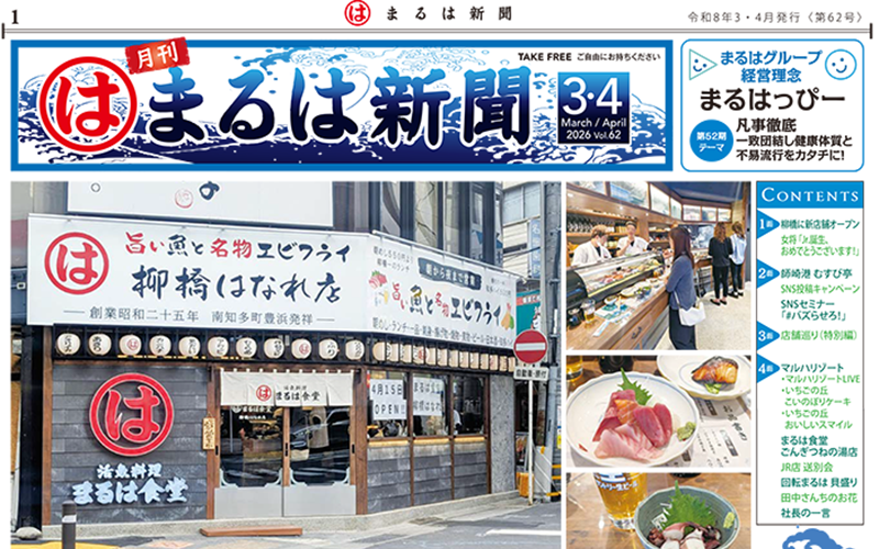 2026.03.30【JR名古屋駅店】臨時休業のご案内 2026.04.25【まるはグループ】まるは新聞 令和8年3・4月号のご案内 2026.04.25【まるはリゾート】4/28(火)ダイニングレストラン貸切のお知らせ 2026.04.13【柳橋はなれ】4月15日(水)OPEN 2026.04.12【南知多豊浜本店】GW特別営業 営業時間のご案内 もっと見る オンラインショップ まるはとは 採用情報 お客様の声 メールマガジン登録 Instagram 社長ブログ 各店舗ブログ まるは食堂